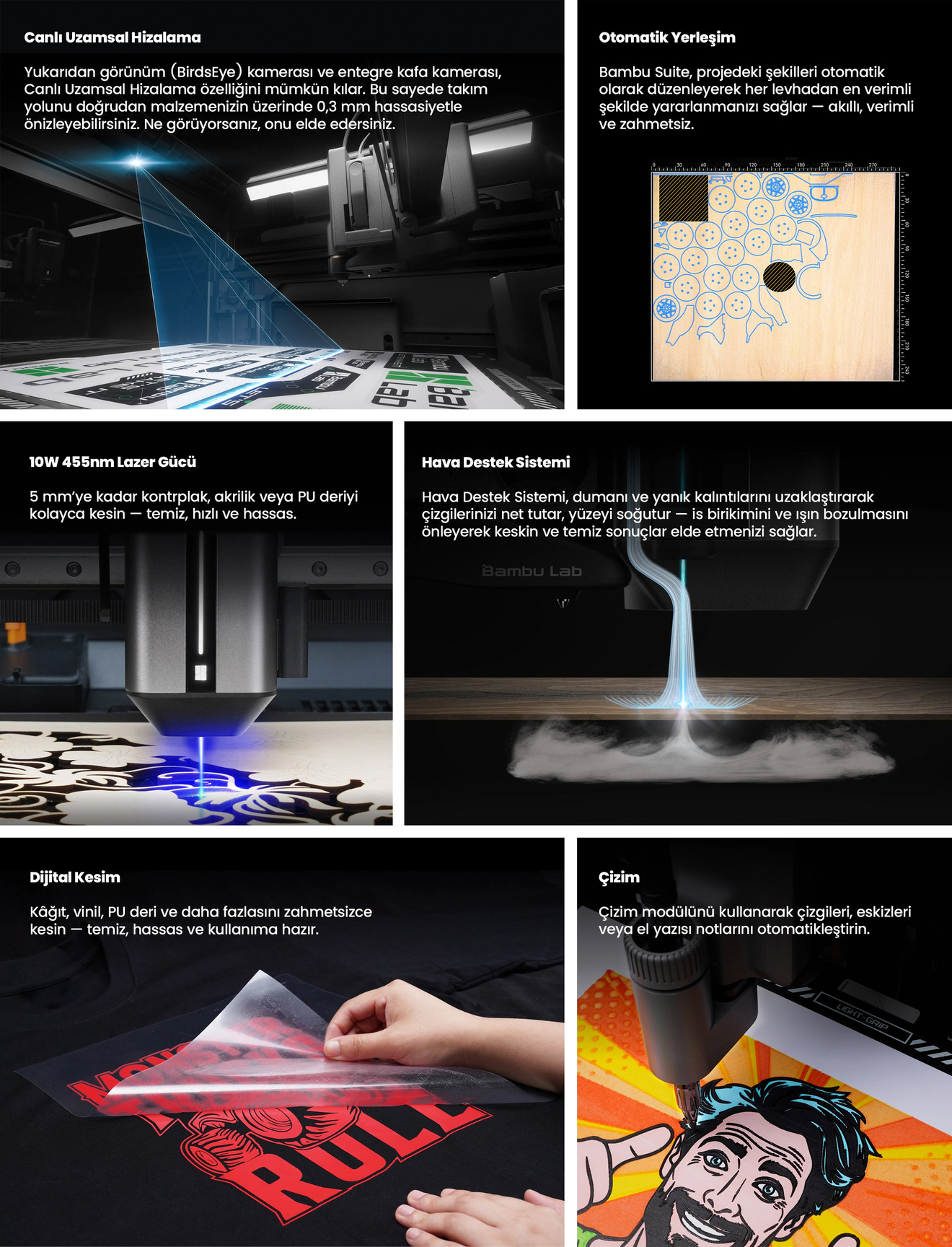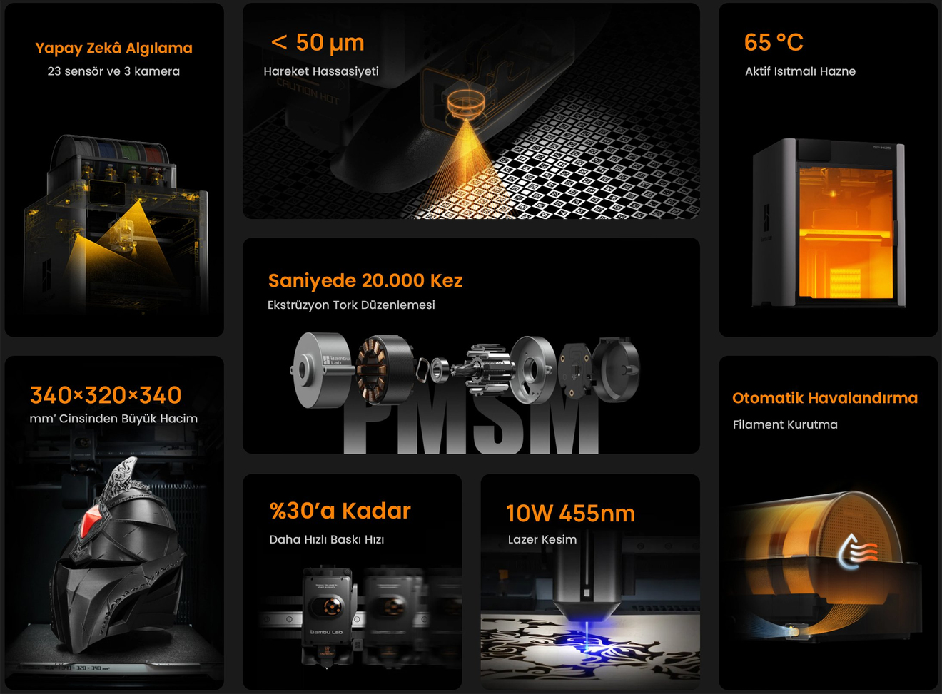 Bambu Lab H2S 3D Yazıcı, mühendisler, ürün geliştirme ekipleri ve profesyonel atölyeler için tasarlanmış bir devrim niteliğindedir. Bambu Lab H2S; endüstriyel doğruluk, yüksek hız ve çok yönlü işleme kabiliyetini tek bir platformda birleştirir. H2S, 65 °C aktif hazne ısıtması, < 50 µm hareket doğruluğu, gelişmiş sensör ve kamera ağı ile hem büyük hacimli fonksiyonel parçaları hem de hassas lazer kesim/gravür işlerini güvenle yürütmenizi sağlar.